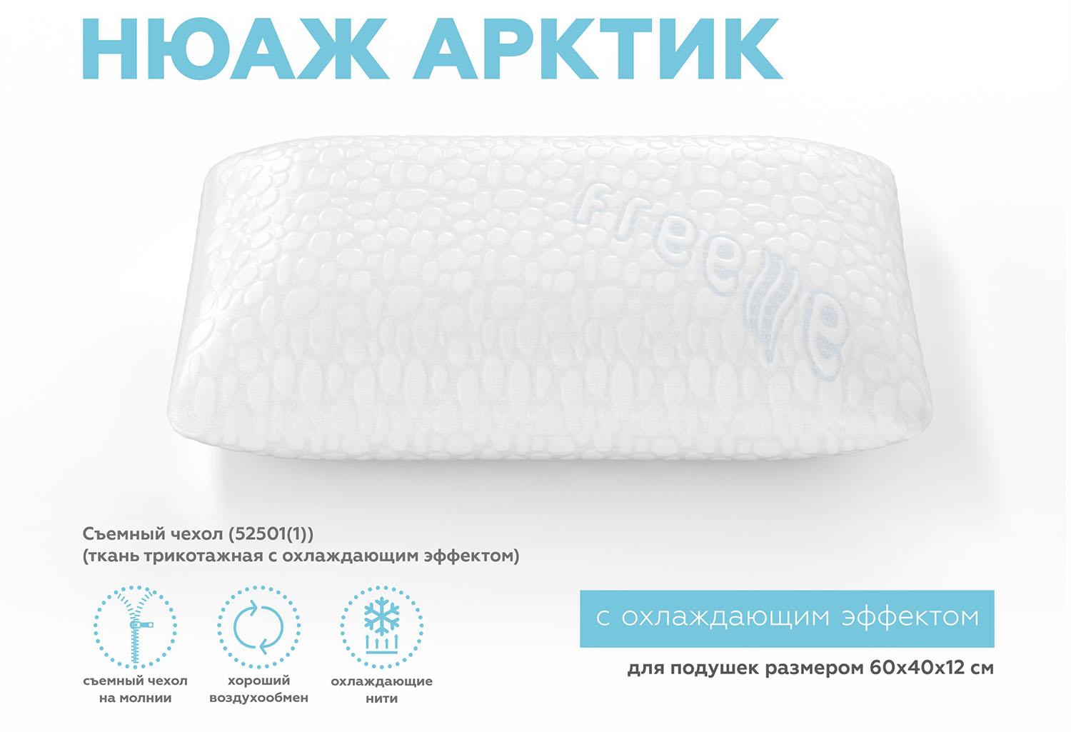 Чехол для подушки «Нюаж Арктик» помимо своей основной функции, гигиенической защиты подушки от негативного воздействия окружающей среды, выполняет ещё и терморегулирующую функцию с бьюти-эффектом: предотвращает нагревание головы во время сна, а следовательно, предотвращает появление отёков, продлевает красоту и молодость кожи. Такая возможность появилась благодаря использованию инновационных охлаждающих нитей в составе ткани.